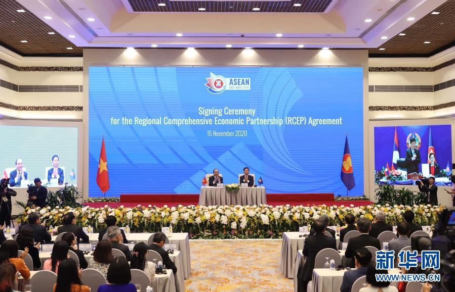 這是2020年11月15日在越南首都河內(nèi)拍攝的區(qū)域全面經(jīng)濟伙伴關(guān)系協(xié)定(RCEP)簽署儀式現(xiàn)場。新華社/越通社