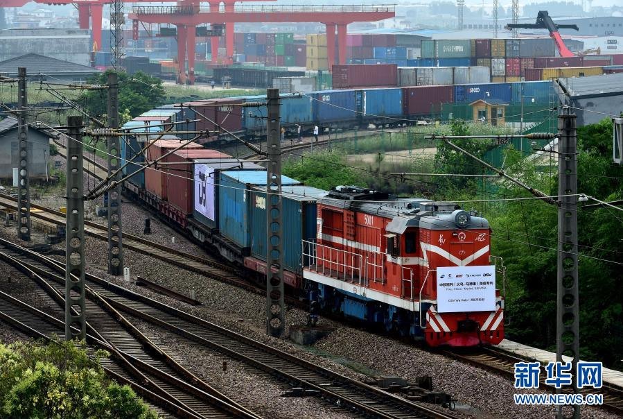 這是2020年6月5日,滿載防疫物資的“義新歐”中歐班列(義烏-馬德里)在義烏西站啟程,前往西班牙首都馬德里。新華社發(fā)(呂斌攝)