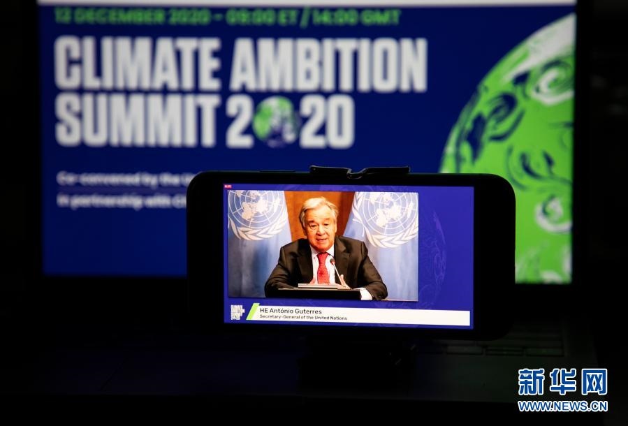 這是2020年12月12日在美國紐約拍攝的聯(lián)合國秘書長古特雷斯在氣候雄心峰會上通過視頻發(fā)表講話的屏幕畫面。氣候雄心峰會由聯(lián)合國及有關(guān)國家倡議舉辦,旨在紀(jì)念《巴黎協(xié)定》達(dá)成五周年,進一步動員國際社會強化氣候行動,推進多邊進程。新華社記者