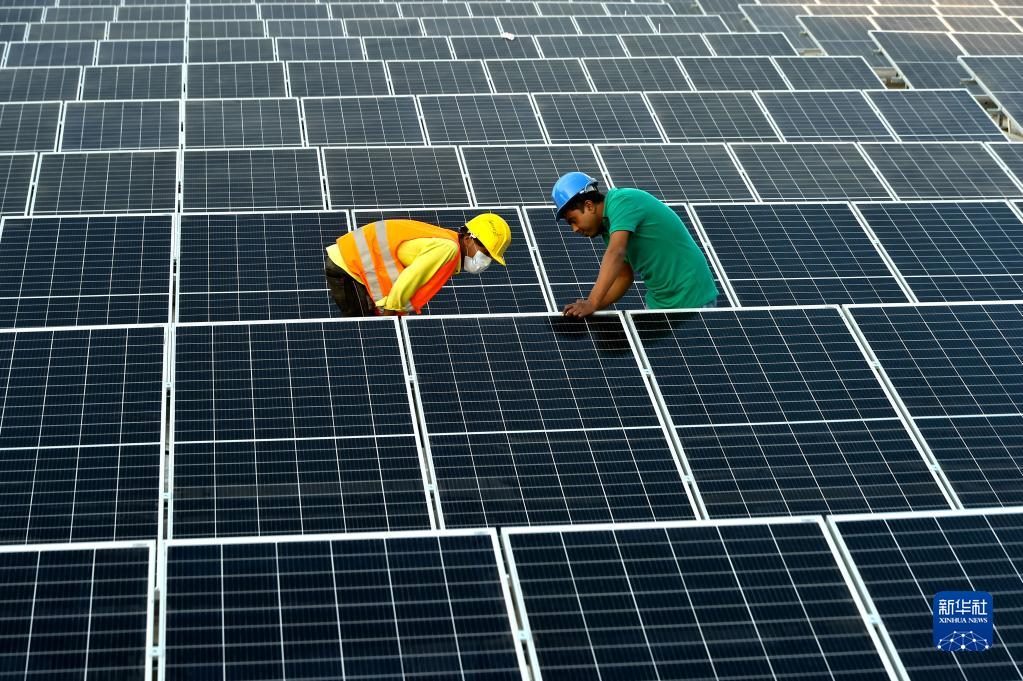 2021年1月3日,在位于孟加拉國首都達(dá)卡郊區(qū)的利德成集團廠區(qū),工人們在房頂組裝光伏模組。從2020年開始,中資制衣類企業(yè)——利德成集團在其位于孟加拉國達(dá)卡的廠區(qū)內(nèi)建設(shè)光伏電站,以降低對傳統(tǒng)能源的依賴,減少碳排放,從綠色發(fā)展的角度助力“一帶一路”建設(shè)。新華社發(fā)