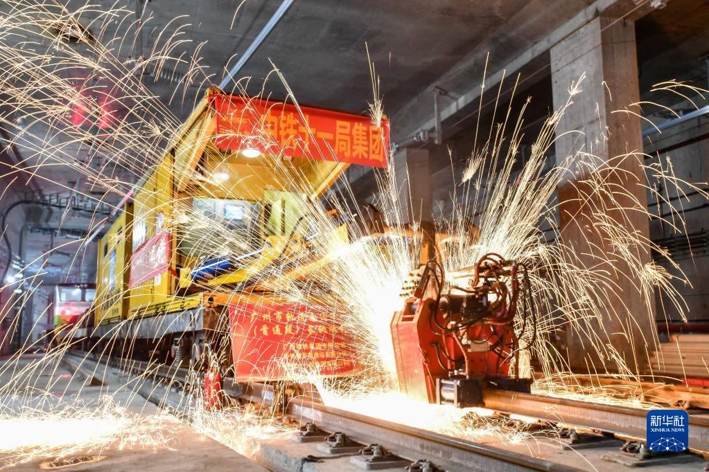 中鐵十一局軌道焊機(jī)在焊接廣州地鐵18號(hào)線首通段最后一個(gè)鋼軌接頭(4月20日攝)。新華社記者劉大偉攝