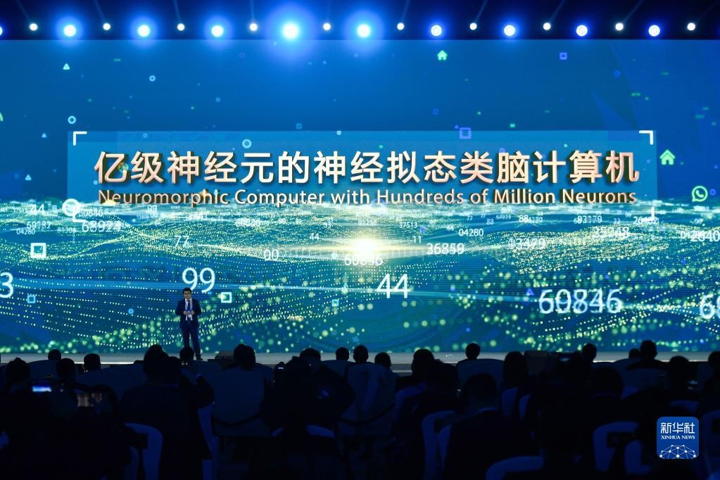 浙江大學(xué)、之江實驗室代表在“世界互聯(lián)網(wǎng)領(lǐng)先科技成果發(fā)布”活動上介紹“億級神經(jīng)元的神經(jīng)擬態(tài)類腦計算機(jī)”(2020年11月23日攝)。新華社記者 黃宗治 攝