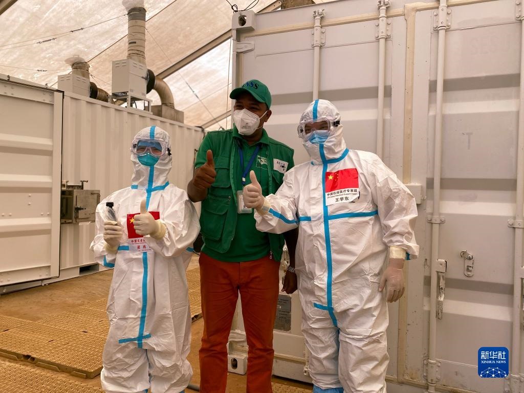2020年9月2日,在幾內(nèi)亞首都科納克里一個核酸檢測取樣點,中國抗疫醫(yī)療專家組成員與當(dāng)?shù)毓ぷ魅藛T合影。新華社發(fā)(專家組供圖)