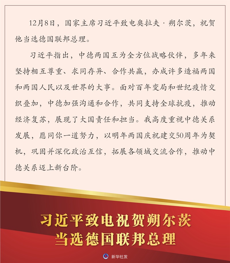 新華社北京12月8日電 12月8日,國(guó)家主席習(xí)近平致電奧拉夫·朔爾茨,祝賀他當(dāng)選德國(guó)聯(lián)邦總理。