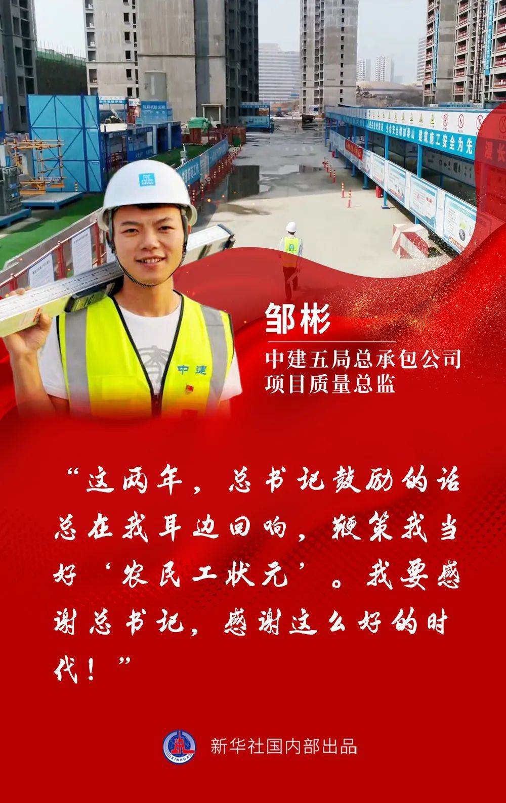 鄒彬出生在湖南新化的一個小山村,16歲輟學后就跟隨父親來到建筑工地,成為當時2億多農民工中的一員。憑借吃苦耐勞和勤學苦練,鄒彬的砌墻技藝成了他所在的中建五局的標桿。20歲那年,他代表中國參加第43屆世界技能大賽,作為唯一取得砌筑項目參賽資格的中國選手,贏得了該項比賽優(yōu)勝獎,實現(xiàn)中國在砌筑項目“零”的突破。