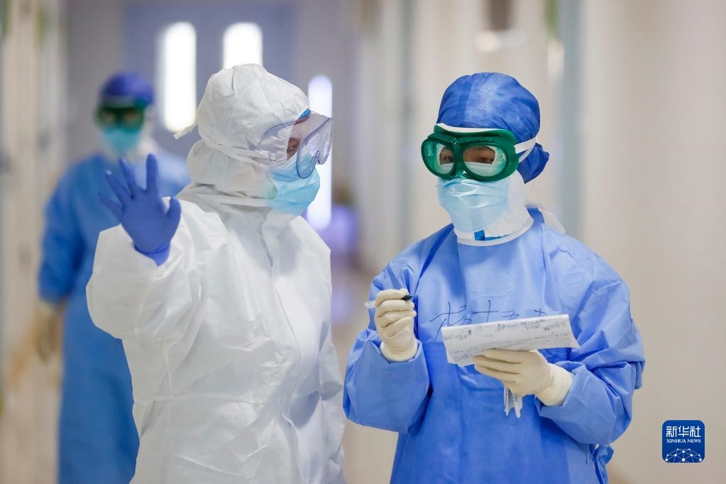 在武漢市金銀潭醫(yī)院的一個病區(qū),金銀潭醫(yī)院護士與浙江省人民醫(yī)院護士(右)交接工作(2020年3月18日攝)。新華社記者 沈伯韓 攝