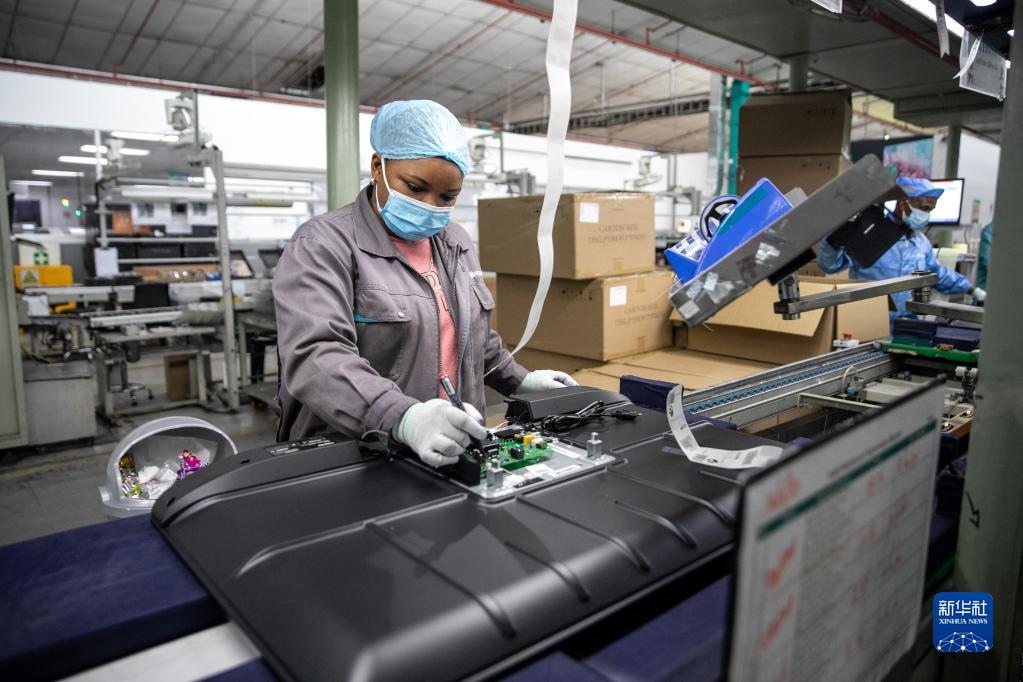 2022年6月1日,當?shù)貑T工在南非開普敦海信南非工業(yè)園的電視機生產(chǎn)線上工作。新華社記者呂天然攝