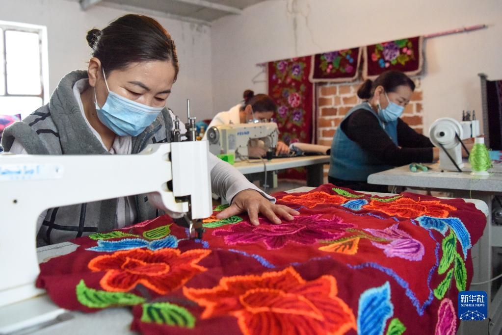 在新疆吉木薩爾縣白泉村刺繡專(zhuān)業(yè)合作社,繡娘在制作哈薩克族刺繡(2021年1月23日攝)。新華社記者 丁磊 攝