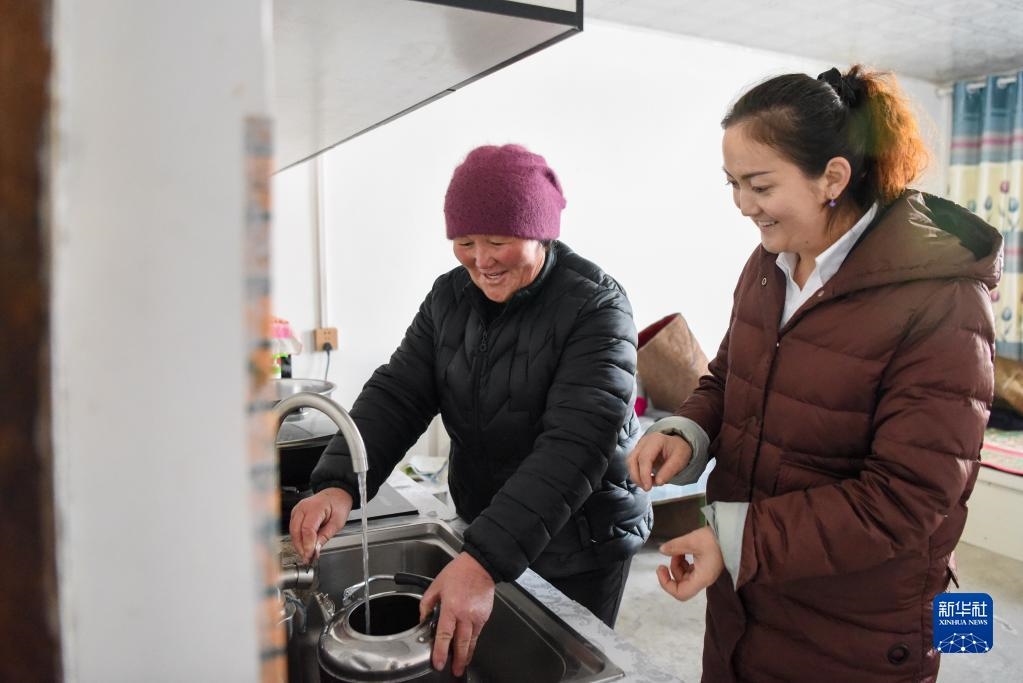在新疆福??h解特阿熱勒鎮(zhèn)京什開(kāi)薩爾村,村干部(右)來(lái)到前不久剛接通自來(lái)水的村民家中了解水質(zhì)情況(2021年11月25日攝)。新華社記者 丁磊