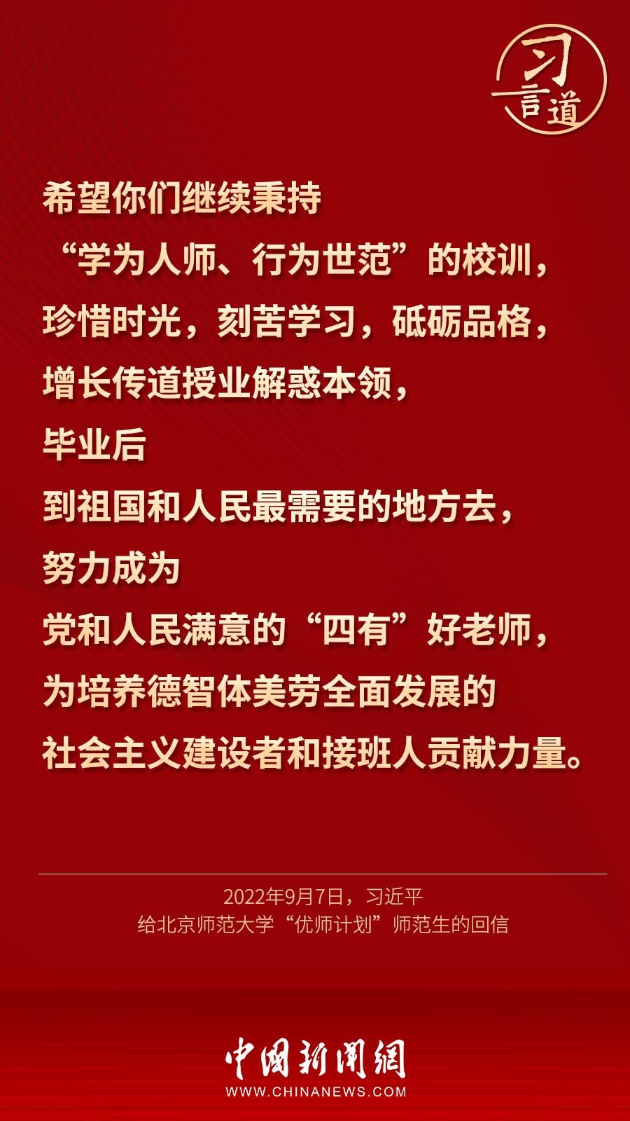 9月7日,習(xí)近平總書(shū)記回信勉勵(lì)北京師范大學(xué)“優(yōu)師計(jì)劃”師范生,努力成為黨和人民滿(mǎn)意的“四有”好老師。十八大以來(lái),習(xí)近平多次通過(guò)書(shū)信的形式,對(duì)教師群體寄予殷切期望。