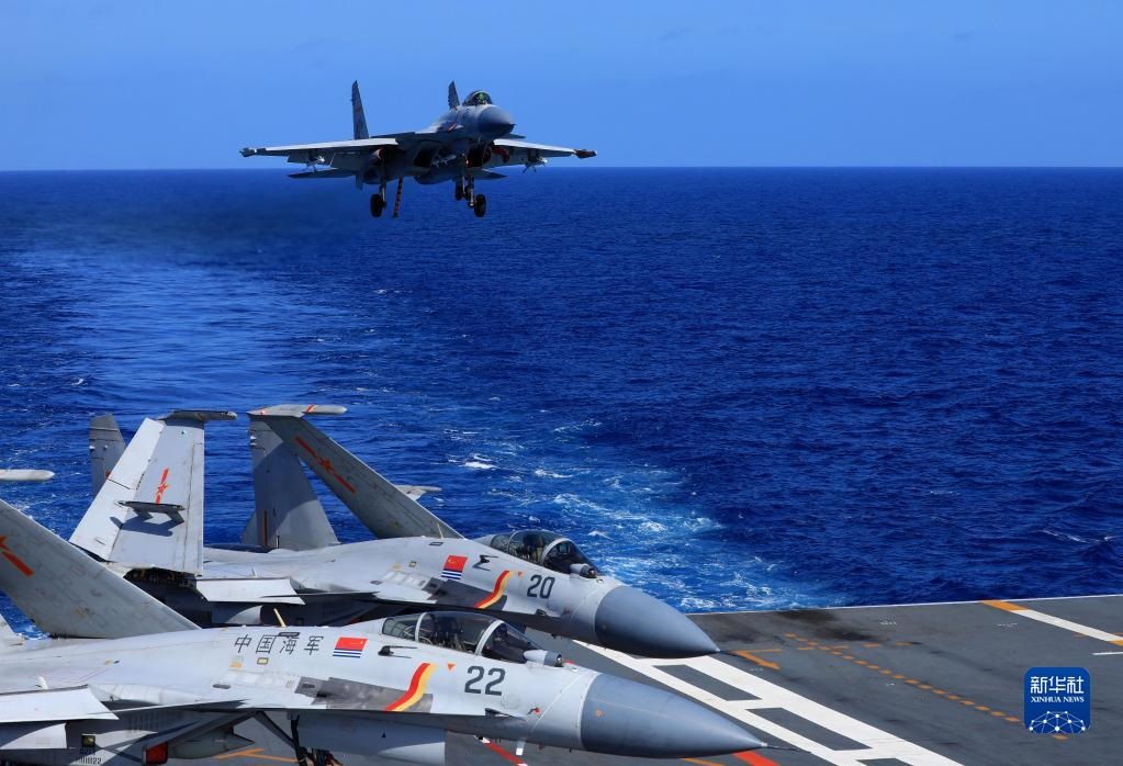 海軍遼寧艦編隊遠海實戰(zhàn)化訓練期間,殲-15艦載戰(zhàn)斗機準備著艦(資料照片)。新華社發(fā)(胡善敏攝)