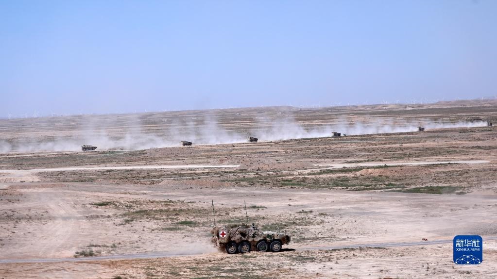 在“西部·聯(lián)合-2021”演習第一次實兵實裝實彈合練中,野戰(zhàn)救護力量為聯(lián)合任務部隊提供保障(2021年8月5日攝)。新華社記者劉芳攝