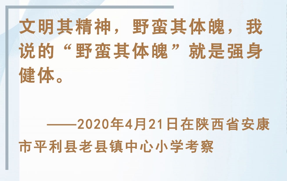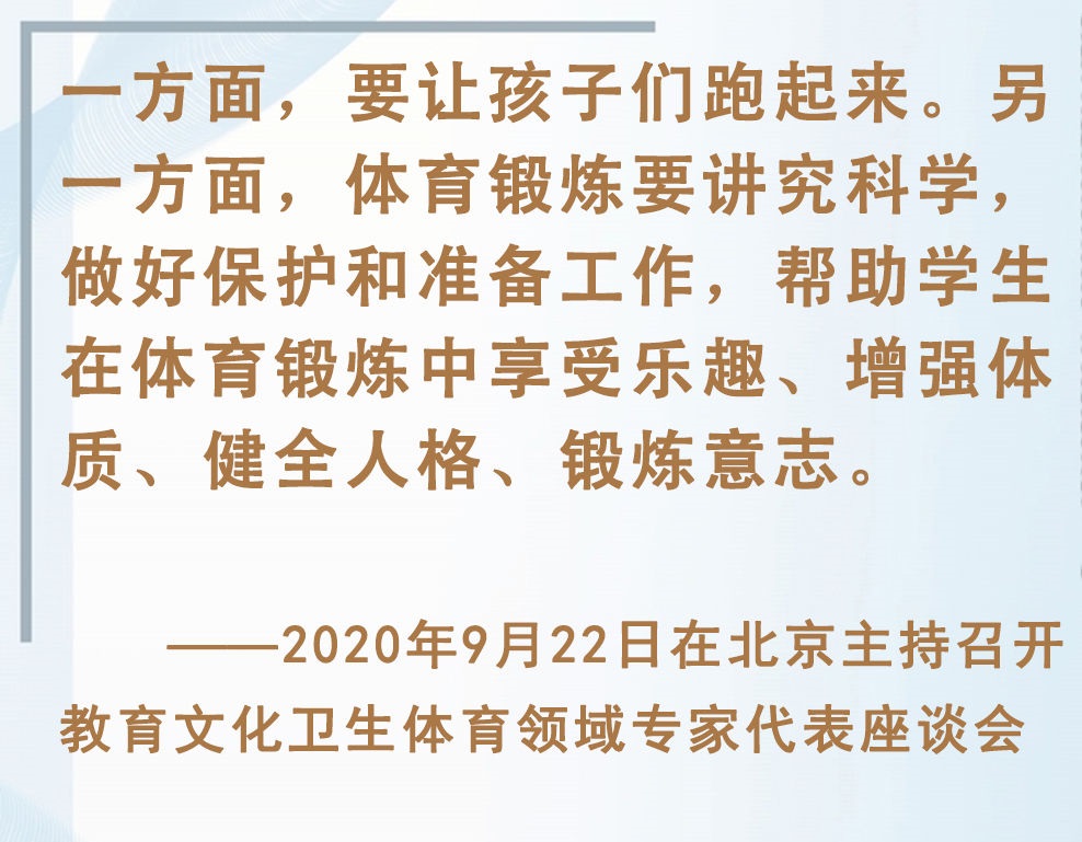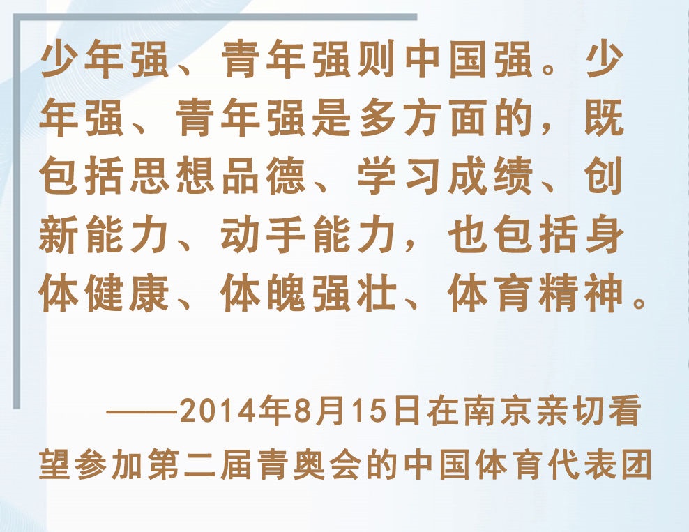 青少年是祖國(guó)的未來(lái)、民族的希望。強(qiáng)健的體魄是青少年成長(zhǎng)成才的重要前提。對(duì)加強(qiáng)體育教育,增強(qiáng)青少年體質(zhì),習(xí)近平總書(shū)記念茲在茲。