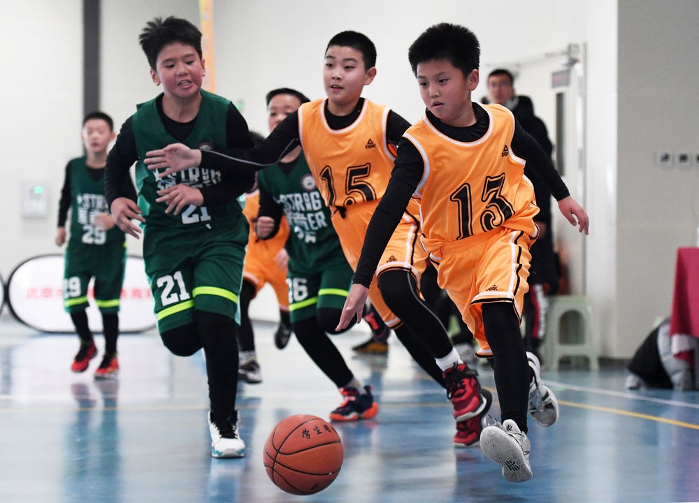 ↑新疆烏魯木齊市烏魯木齊縣第一中學(xué)小學(xué)部冰球隊(duì)的學(xué)生在進(jìn)行冰球比賽(2022年1月12日攝)。