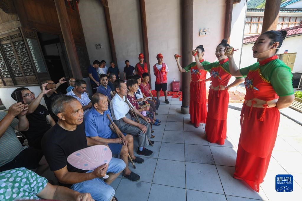 浙江省杭州市臨安區(qū)高虹鎮(zhèn)廉政文藝宣傳隊在石門村表演快板小段《清廉高虹》(2021年9月1日攝)。新華社記者 徐昱 攝