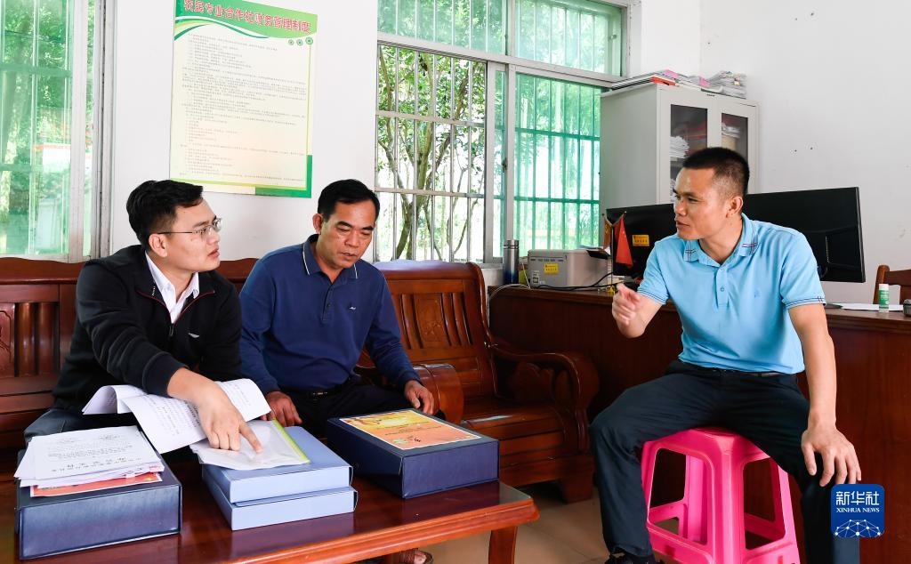 在海南省瓊中黎族苗族自治縣灣嶺鎮(zhèn)加章村委會,紀檢監(jiān)察干部(左一)在查閱鄉(xiāng)村振興及村級財務(wù)支出相關(guān)材料(2021年11月13日攝)。新華社記者 楊冠宇 攝