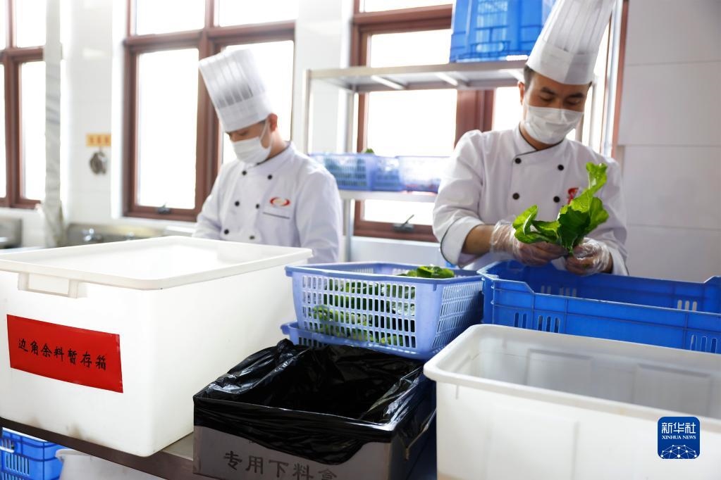 在某中央國家機關(guān)食堂,廚師將菜根等邊角余料放入暫存箱(2020年10月26日攝)。新華社記者 劉彬 攝
