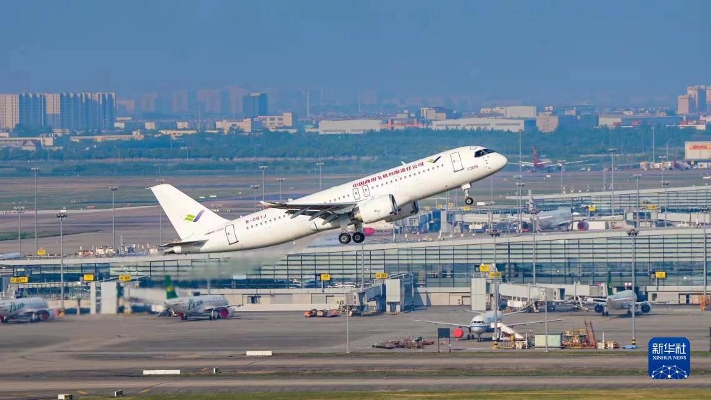 2022年5月14日6時52分,編號為B-001J的C919大飛機(jī)從上海浦東機(jī)場第4跑道起飛,于9時54分安全降落,標(biāo)志著中國商飛公司即將交付首家用戶的首架C919大飛機(jī)首次飛行試驗(yàn)圓滿完成。新華社發(fā)