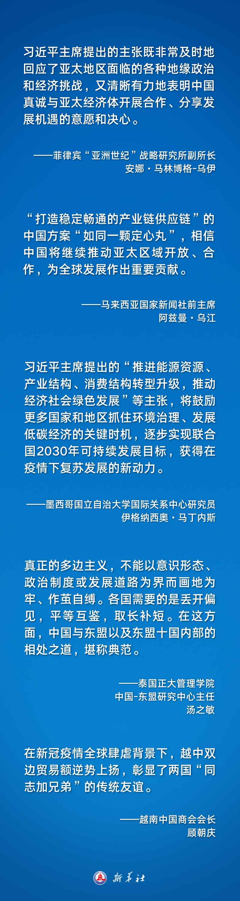 “和平是亞太地區(qū)各經(jīng)濟(jì)體實(shí)現(xiàn)發(fā)展和繁榮的首要因素,習(xí)近平主席的論述正是強(qiáng)調(diào)了這一點(diǎn),也明確了亞太地區(qū)加強(qiáng)合作與維護(hù)多邊主義的重要性。”安娜·馬林博格-烏伊說(shuō)。