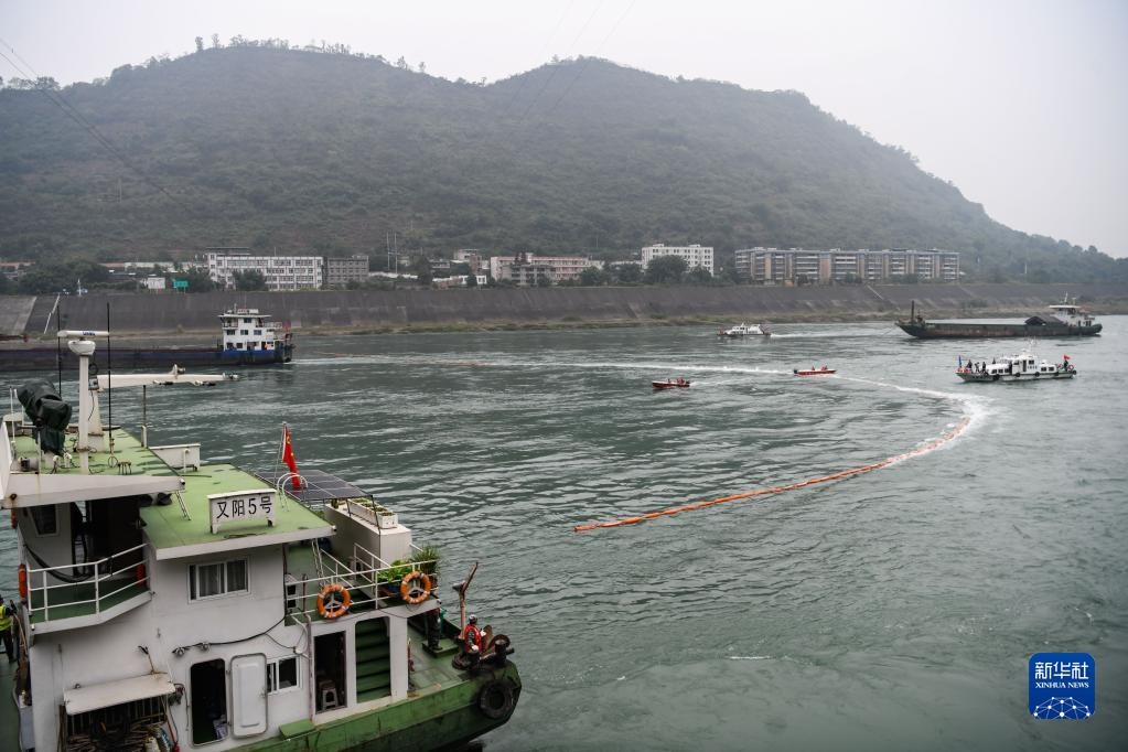 11月9日,在四川省宜賓市敘州區(qū)的長江流域突發(fā)生態(tài)環(huán)境事件應(yīng)急綜合演練現(xiàn)場,多方部門協(xié)作在金沙江面布設(shè)圍油欄。新華社記者 王曦 攝
