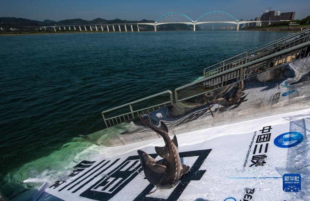在湖北省宜昌市舉行的“2022年長江三峽中華鱘放流活動(dòng)”現(xiàn)場,中華鱘從放流通道滑入長江(4月9日攝)。新華社發(fā)(鄭家裕 攝)