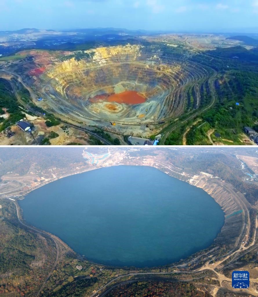 拼版照片:上圖為開采中的安徽省馬鞍山市雨山區(qū)向山鎮(zhèn)凹山采場(資料照片),下圖為生態(tài)修復(fù)后的凹山采場(新華社記者劉軍喜11月8日攝,無人機(jī)照片)。新華社發(fā)