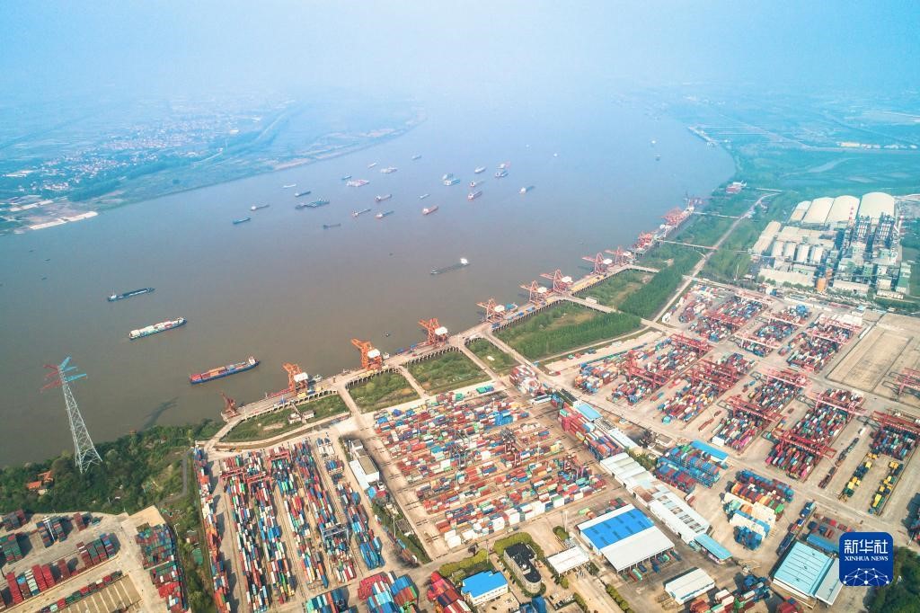 這是武漢長江中游航運(yùn)中心核心港陽邏港(2020年4月12日攝,無人機(jī)照片)。新華社記者 肖藝九 攝