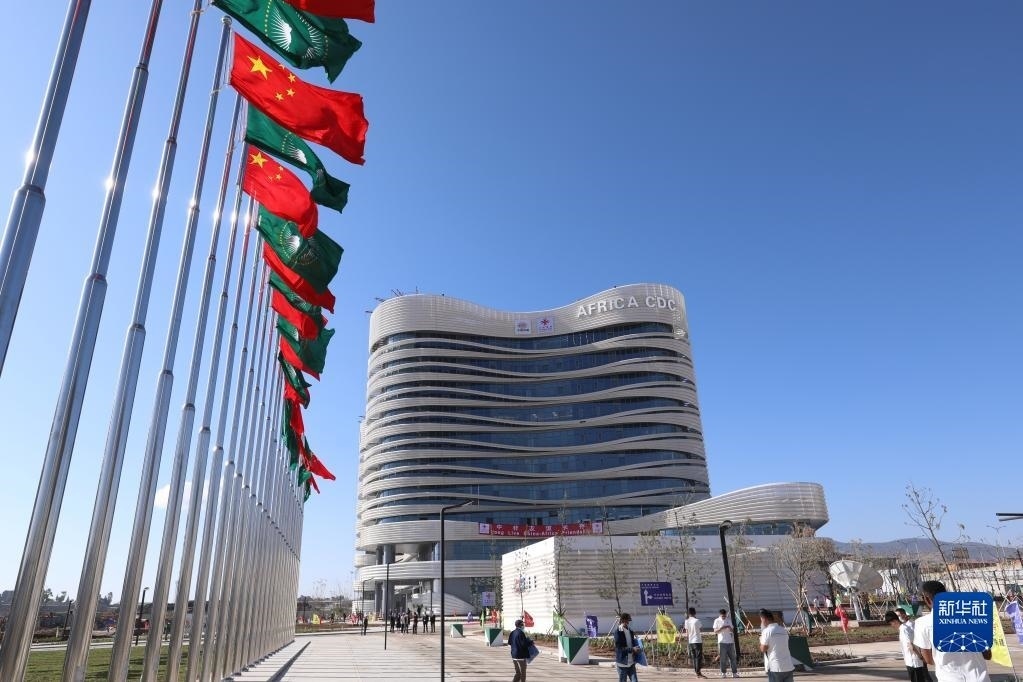 2023年1月11日,埃塞俄比亞首都亞的斯亞貝巴南郊,五星紅旗和非盟會(huì)旗迎風(fēng)飄展,中國援非盟非洲疾控中心總部(一期)項(xiàng)目竣工儀式在這里舉行。