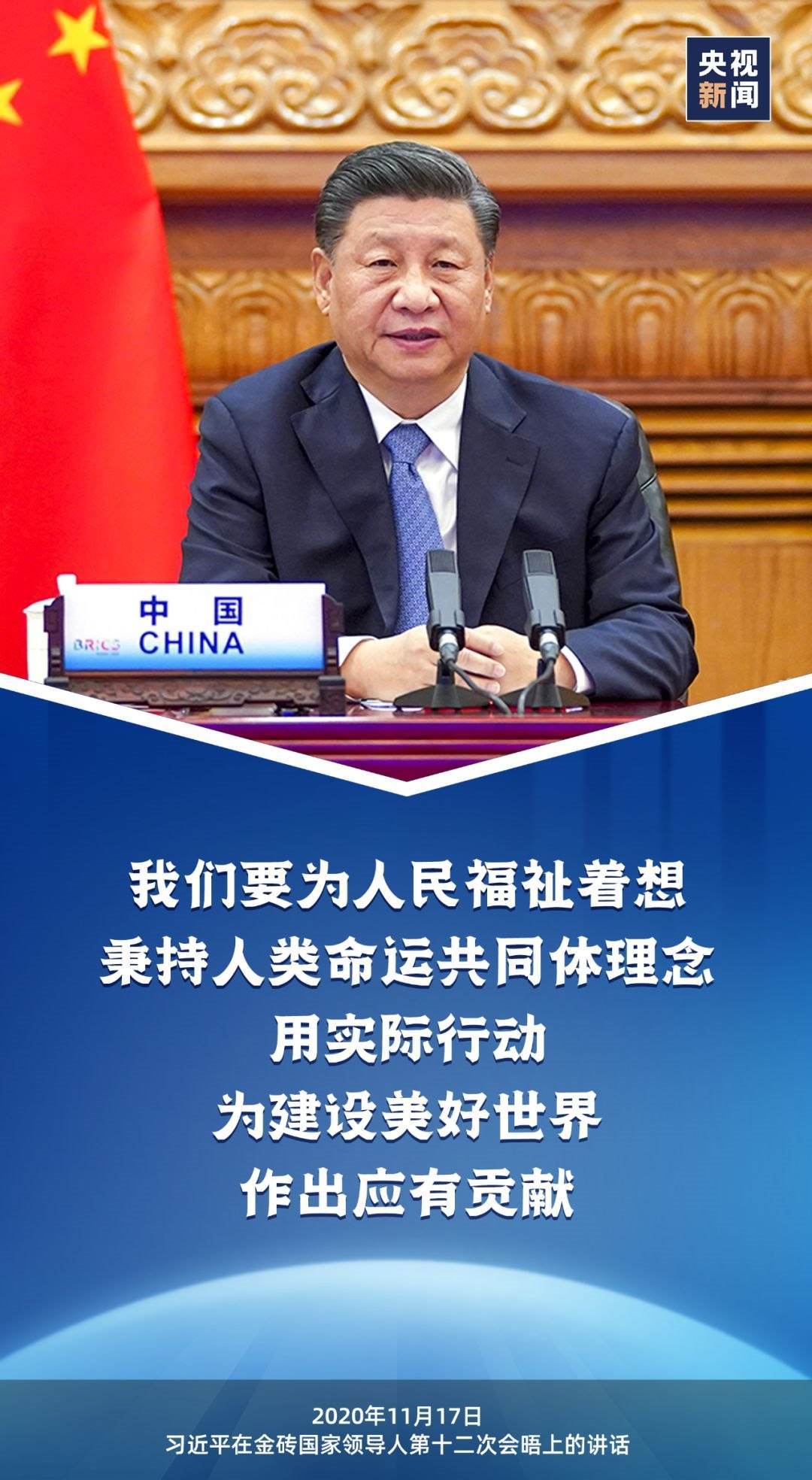 2020年11月17日,國家主席習近平出席金磚國家領導人第十二次會晤并發(fā)表重要講話時指出,“我們要為人民福祉著想,秉持人類命運共同體理念,用實際行動為建設美好世界作出應有貢獻?!?/p>