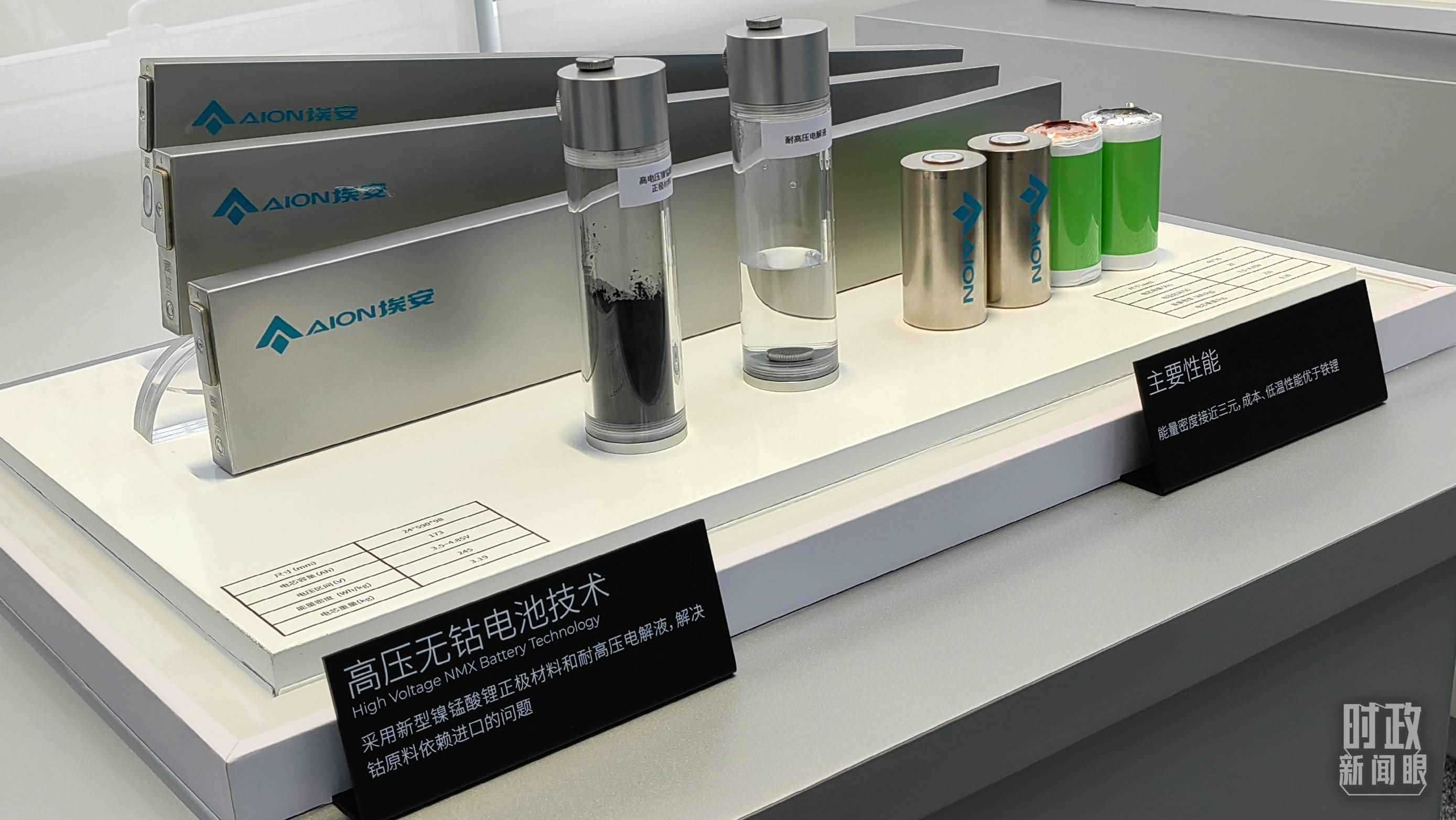 △廣汽埃安展示的高壓無鈷電池技術(shù),采用新型鎳錳酸鋰正極材料和耐高壓電解液,解決了鈷原料依賴進(jìn)口的問題。(總臺央視記者張曉鵬拍攝)