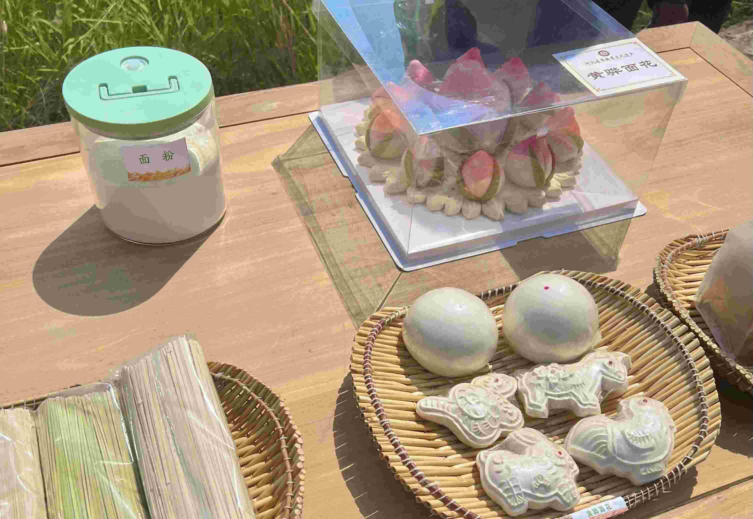 在楊東進家麥田的路邊,擺放著一張長方形的木桌。桌上擺放著用于展示的旱堿麥的植株和麥粒樣本,以及由旱堿麥制成的面粉、掛面、饅頭和黃驊面花等產品,總書記在這里駐足觀看。印刻著寓意吉祥圖案的黃驊面花,被列為省級非物質文化遺產。