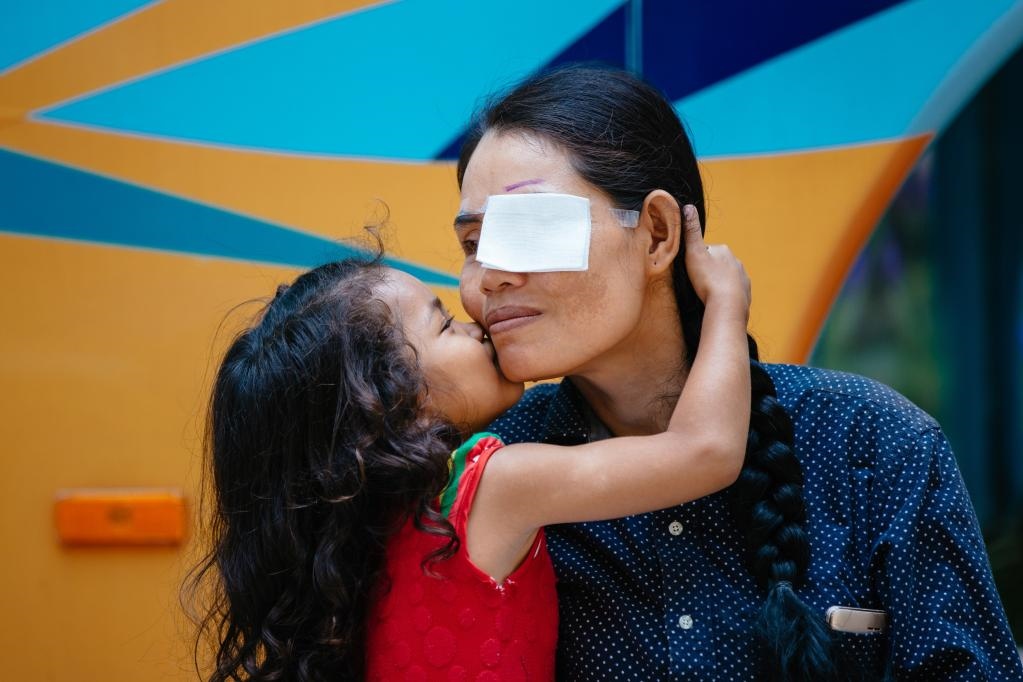 2019年3月15日,在柬埔寨磅湛省醫(yī)院,即將接受白內(nèi)障手術的患者孫美樂接受女兒的親吻祝福。在接受了中國醫(yī)療隊的白內(nèi)障義診手術后,她的視力逐步恢復,生活有了新的光明和希望。