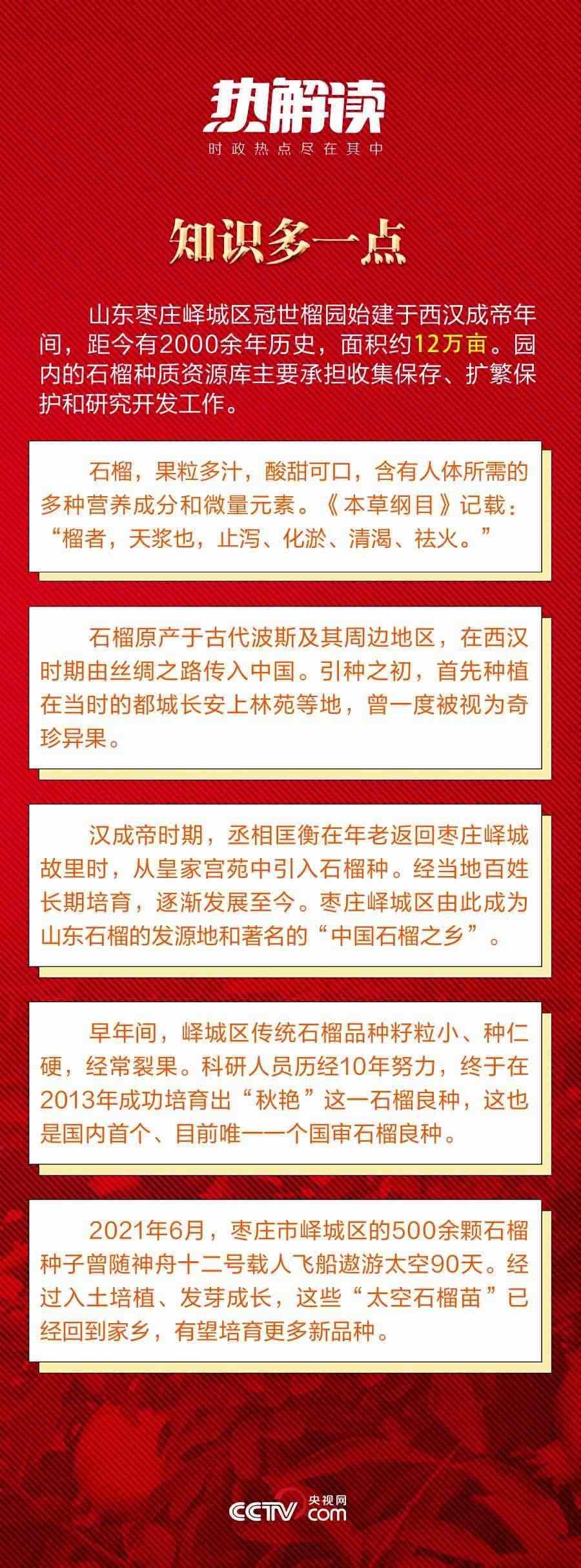 歷經(jīng)千年,當(dāng)年自異域“舶來(lái)”的奇珍異果,已經(jīng)成為遍地開(kāi)花的致富果、幸福果。山東棗莊火紅的石榴給這座小城帶來(lái)了紅火的發(fā)展機(jī)遇,也給老百姓帶來(lái)了紅火的生活。