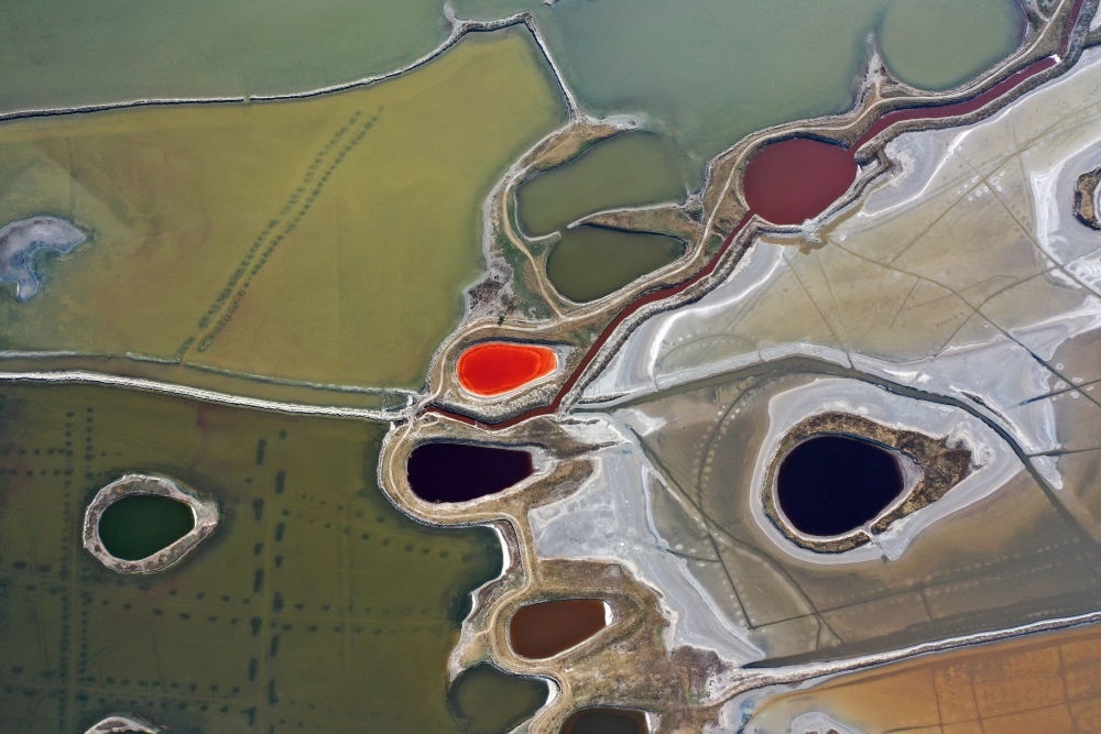 山西運(yùn)城鹽湖一角(2021年6月1日攝,無人機(jī)照片)。新華社記者 詹彥 攝