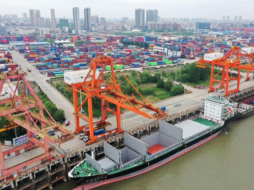 “華航漢亞2號(hào)”貨輪停靠在武漢新港陽邏集裝箱碼頭進(jìn)行裝箱作業(yè)(2020年5月9日攝,無人機(jī)照片)。新華社發(fā)(趙軍 攝)