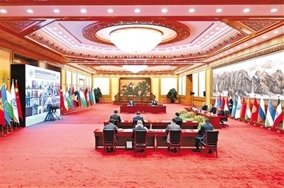 7月4日下午,國家主席習(xí)近平在北京以視頻方式出席上海合作組織成員國元首理事會第二十三次會議并發(fā)表題為《牢記初心使命 堅持團結(jié)協(xié)作 實現(xiàn)更大發(fā)展》的重要講話。新華社記者 申 宏攝
