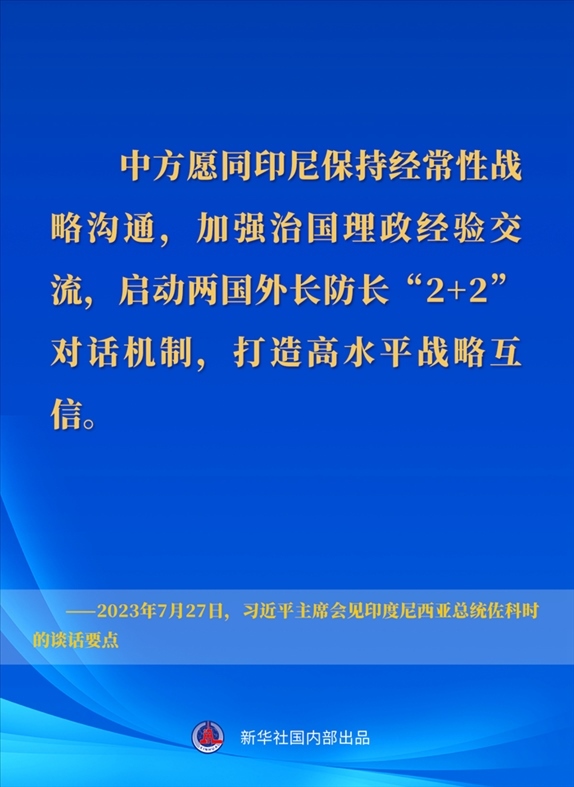 7月27日下午,國家主席習(xí)近平在成都會(huì)見來華出席第31屆世界大學(xué)生夏季運(yùn)動(dòng)會(huì)開幕式并訪華的印度尼西亞總統(tǒng)佐科。一起來看習(xí)近平主席在會(huì)見時(shí)的談話要點(diǎn)↓