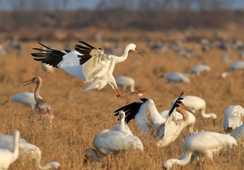 這是2021年1月15日在鄱陽湖畔的江西余干縣康山墾殖場插旗洲拍攝的白鶴。隨著長江重點水域生態(tài)修復(fù)措施的落實,鄱陽湖環(huán)境正發(fā)生嬗變。江西鄱陽湖國家級自然保護(hù)區(qū)管理局2022年新年伊始發(fā)布的鄱陽湖區(qū)最新鳥情數(shù)據(jù)顯示,工作人員在野外監(jiān)測統(tǒng)計到水鳥76.6萬余只,創(chuàng)有監(jiān)測記錄以來新高。
