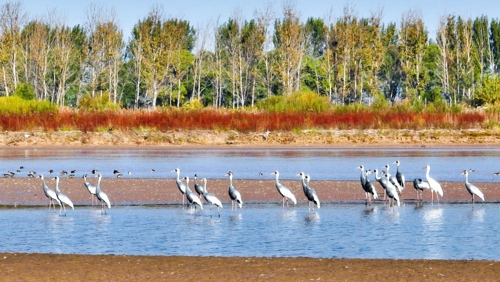 在山東黃河三角洲國(guó)家級(jí)自然保護(hù)區(qū)拍攝的白枕鶴(2022年10月18日攝)。新華社發(fā)(楊斌 攝)