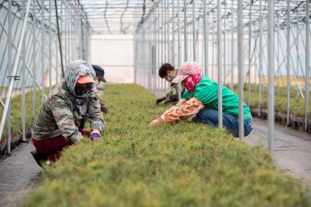 在黑龍江伊春森工集團(tuán)紅松種苗繁育基地,工作人員在養(yǎng)護(hù)輕基質(zhì)紅松苗(2023年5月20日攝)。新華社記者 張濤 攝