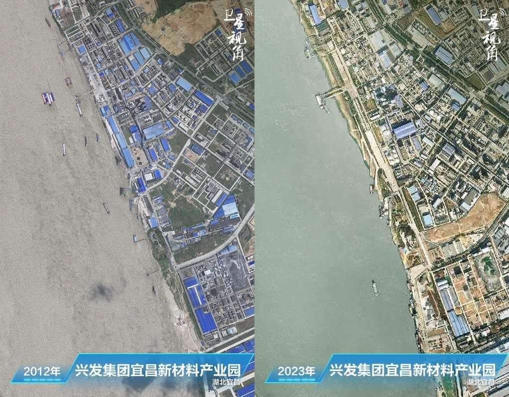 ↑2023年與2012年相比,興發(fā)集團(tuán)宜昌新材料產(chǎn)業(yè)園內(nèi),原來(lái)臨江建設(shè)的生產(chǎn)設(shè)施已經(jīng)搬遷和拆除。