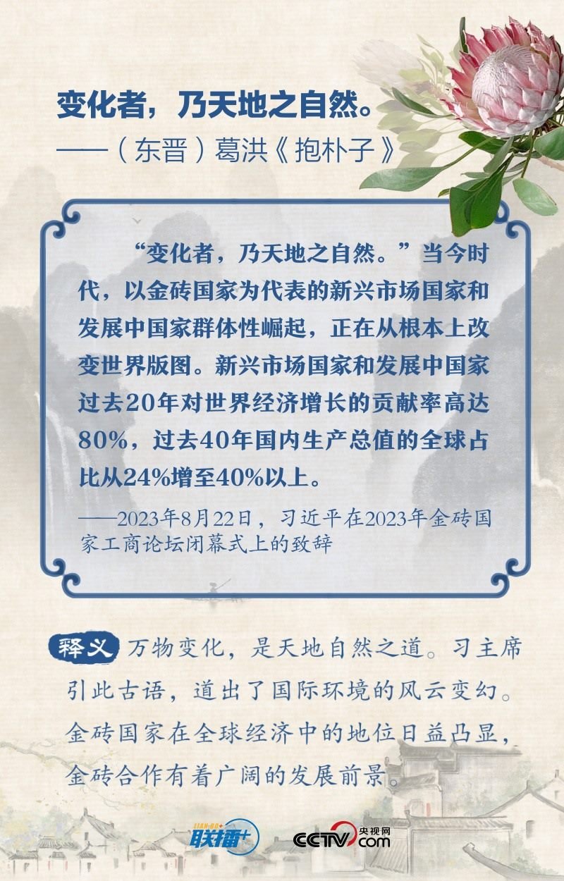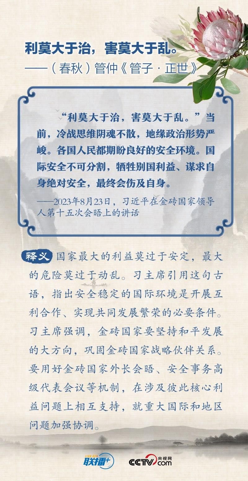 “順理而舉易為力,背時而動難為功”“變化者,乃天地之自然”“利莫大于治,害莫大于亂”…… 2023年的“金磚時間”里,習近平主席多次在講話中引經據典,闡述金磚國家的合作與發(fā)展之道。央視網《聯(lián)播+》特擷取習主席用典金句,與您一起學習。