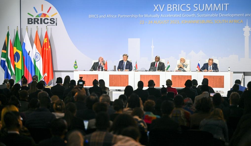23日,在出席金磚國家領(lǐng)導(dǎo)人第十五次會晤時,習(xí)近平主席強調(diào),加速擴員進程,讓更多國家加入到金磚大家庭,集眾智、匯群力,推動全球治理朝著更加公正合理的方向發(fā)展。
