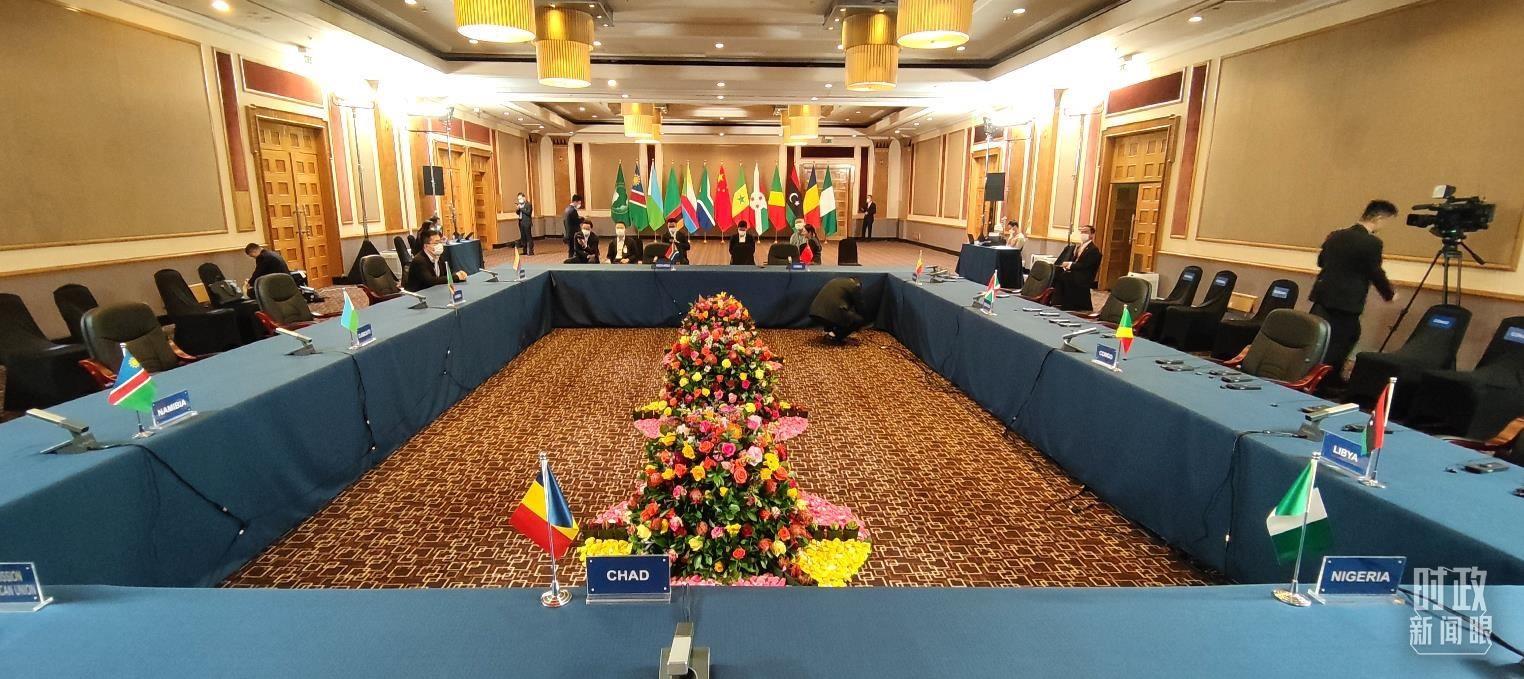 △中非領(lǐng)導(dǎo)人對(duì)話會(huì)會(huì)場擺放的與會(huì)各方旗幟。(總臺(tái)央視記者郭鴻拍攝)