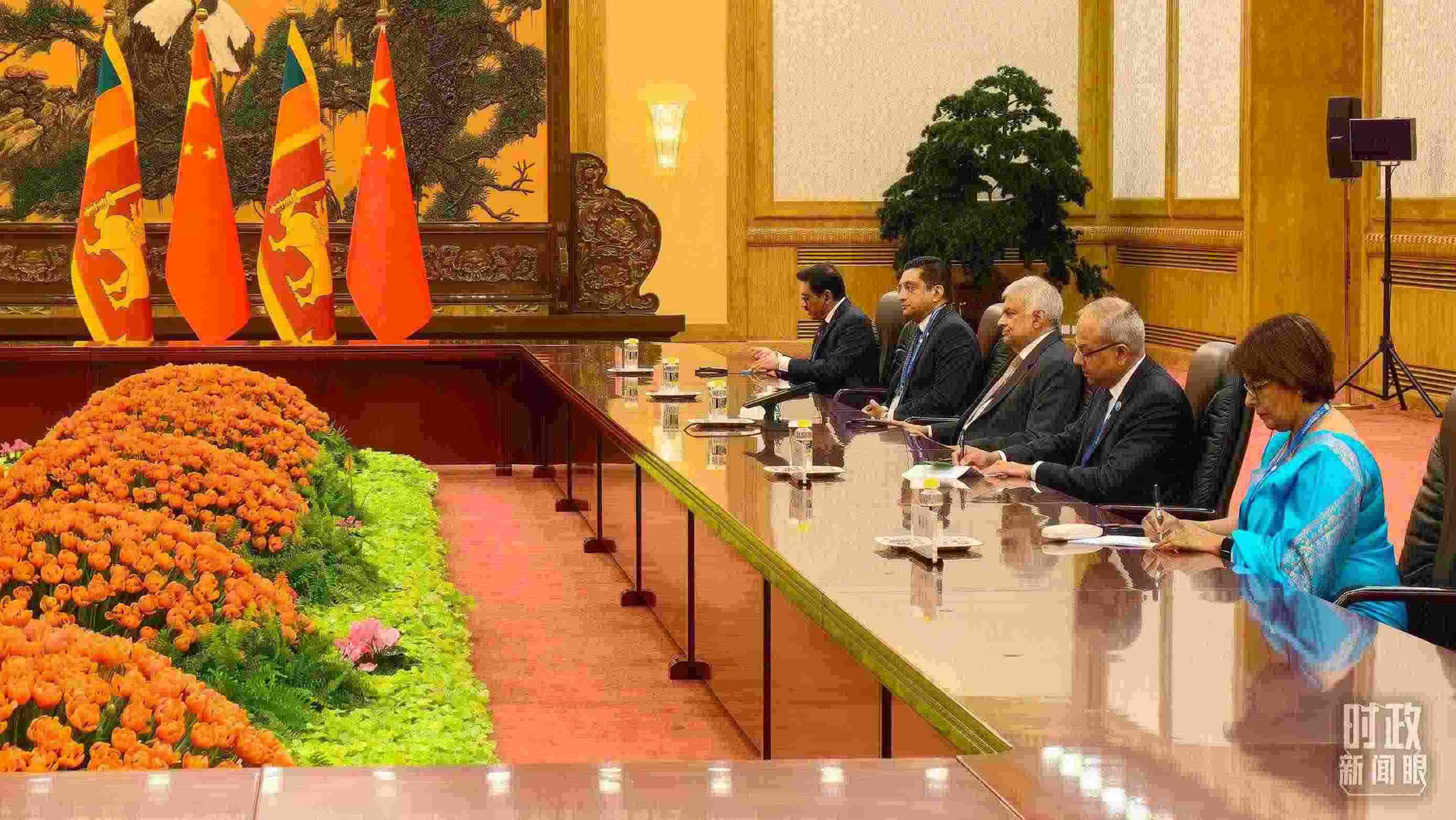 △會(huì)見(jiàn)現(xiàn)場(chǎng)擺放的中國(guó)、斯里蘭卡國(guó)旗。(總臺(tái)央視記者范一鳴拍攝)