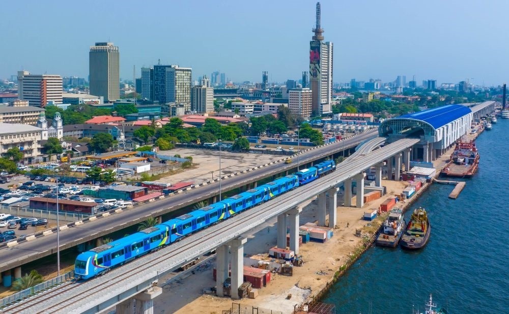 這是尼日利亞拉各斯輕軌藍(lán)線上的一列輕軌列車(2022年12月21日攝,無人機照片)。新華社發(fā)(托普·阿尤庫攝)