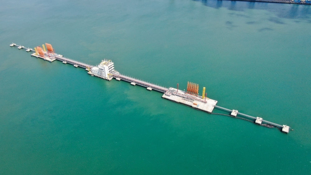 這是肯尼亞蒙巴薩油碼頭(2023年9月20日攝,無人機照片)。新華社發(fā)(中國交通建設(shè)股份有限公司肯尼亞蒙巴薩新建油碼頭項目部供圖)