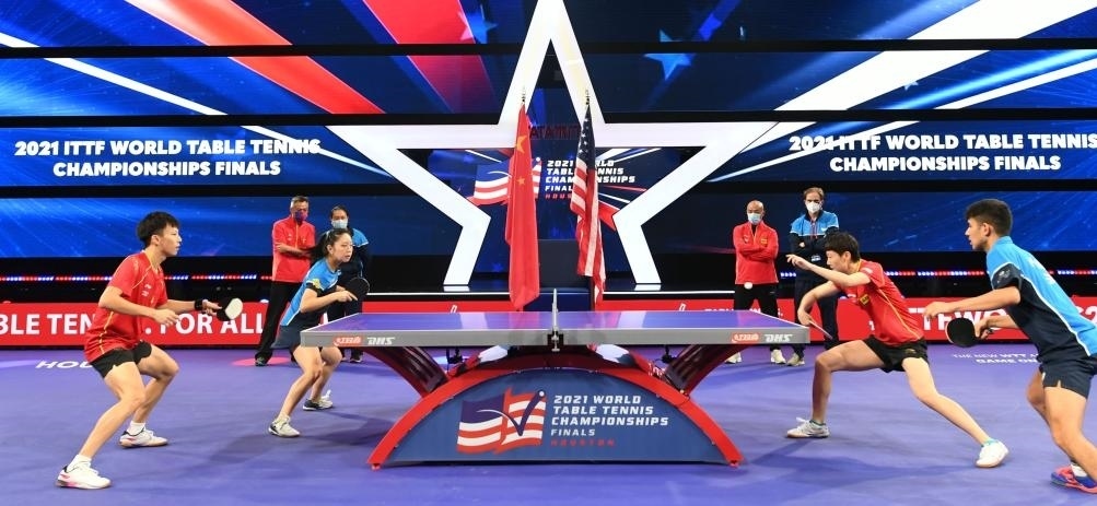 這是中美混雙組合在2021年11月下旬舉行的休斯敦世界乒乓球錦標賽期間合練。中美選手在休斯敦世乒賽上聯(lián)合組隊出戰(zhàn)混合雙打比賽,紀念中美“乒乓外交”50周年。新華社記者 吳曉凌 攝
