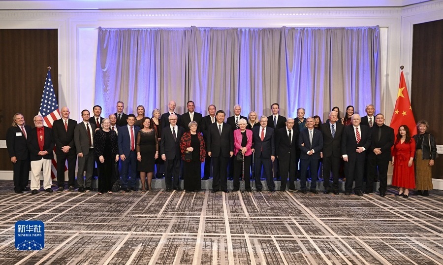 當(dāng)?shù)貢r(shí)間11月15日晚,國家主席習(xí)近平在美國舊金山出席美國友好團(tuán)體聯(lián)合舉行的歡迎宴會(huì)。這是宴會(huì)開始前,習(xí)近平會(huì)見飛虎隊(duì)和史迪威將軍后人、鼓嶺、艾奧瓦州、華盛頓州等方面友好人士代表,同他們親切交談并合影留念。新華社記者 謝環(huán)馳 攝 圖片來源:新華網(wǎng)
