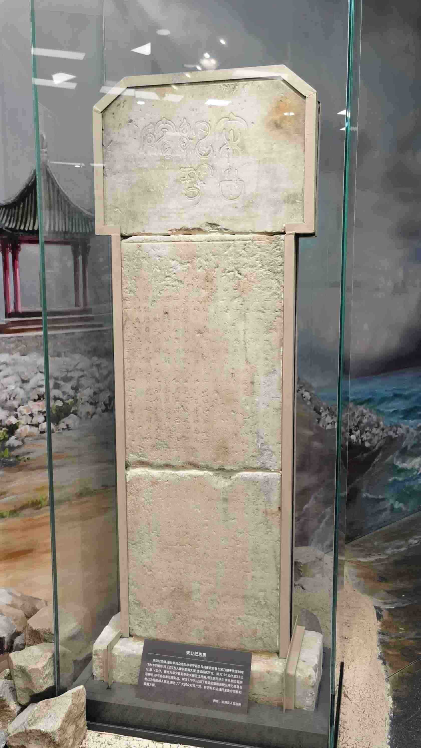 △新四軍紀(jì)念館里的宋公紀(jì)功碑。此碑是鹽阜民眾為紀(jì)念阜寧縣抗日民主政府縣長(zhǎng)宋乃德于1941年組織修筑海防大堤所立。碑文記載了修筑大堤的艱難歷程,表達(dá)了鹽阜民眾對(duì)共產(chǎn)黨、新四軍和抗日民主政府的信賴(lài)和愛(ài)戴之情。(總臺(tái)央視記者郭鴻拍攝)